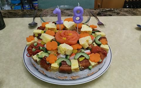 做法: 1. 按个人喜好,在超巿买现成的食材。(烟三文鱼、吞拿鱼、紫菜、中华沙律、腌黄萝卜或八爪鱼) 2. 胡萝卜切片或花,用水烫熟备用。 3. 小黄瓜切丁备用。 4. 用鸡蛋煎厚蛋。 5. 煮珍珠米饭,放凉后,加入寿司醋拌匀。 6. 用蛋糕模具,先在底部放入寿司饭一层,然后放入吞拿鱼,再在上面放一层寿司饭。 7. 在饭面,按个人喜好,将各种食材摆放造形即成。 8. 吃饭时,如蛋糕一样,用刀切开分不同等分放碟子上。